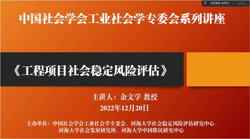 2022年12月20日,“中国社会学会工业社会学专业委员会系列”系列报告暨河海公管大讲堂以腾讯会议的形式举行。工业社会学专业委员会第三届副理事长、亚博取款极速到账余文学教授应邀作了题为“工程项目社会稳定风险评估”的学术报告。