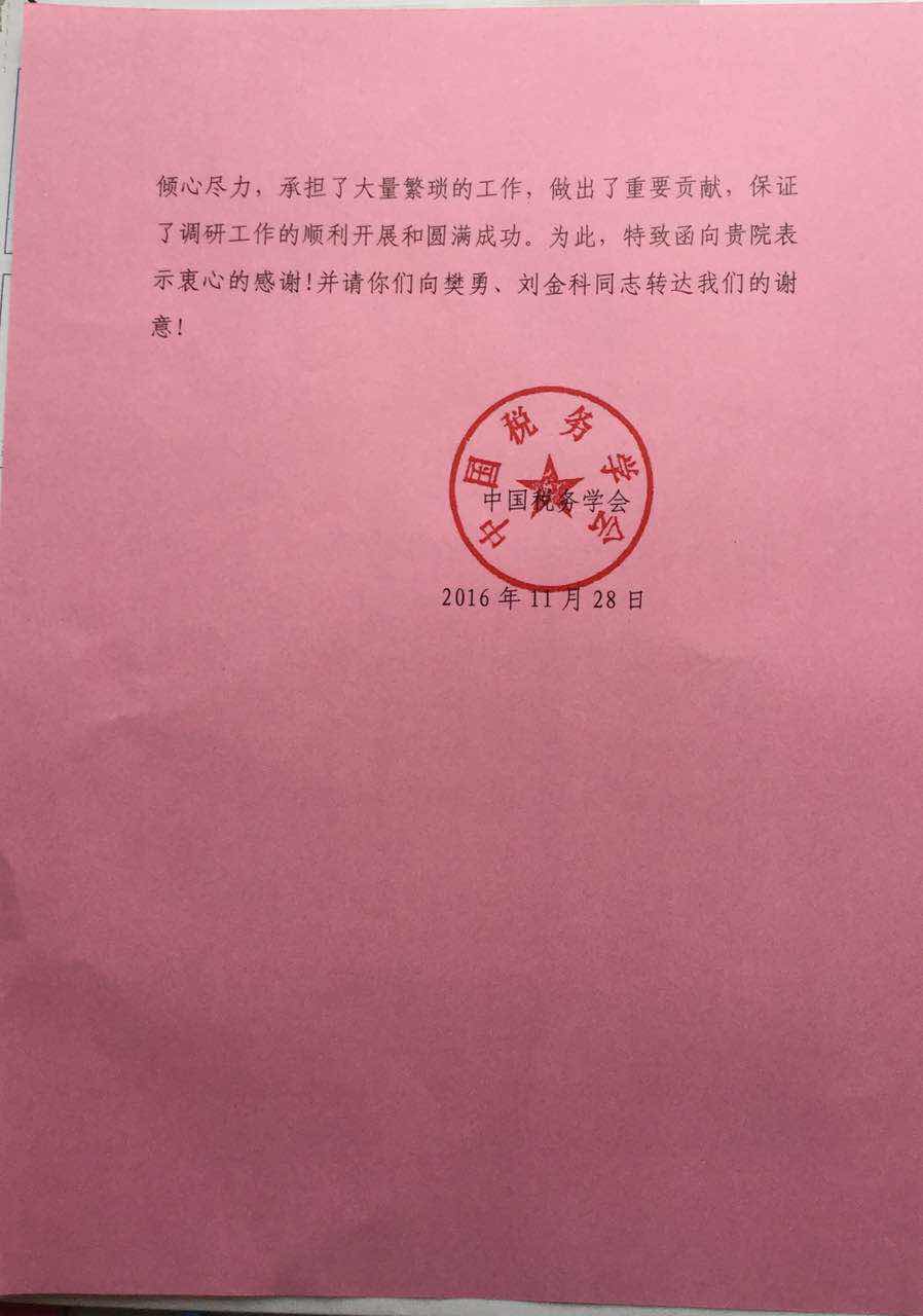 日前,中国税务学会致信感谢Beat365官方网站对学会工作的大力支持,特别感谢樊勇、刘金科两位教师参与金融业营改增税负问题专项课题研究所做出的努力与贡献。学会对两位教师全程参与课题调研工作,克服困难,不辞辛苦、献计献策,承担了大量繁琐的工作,倾心尽力并做出重要贡献,给予了高度肯定。