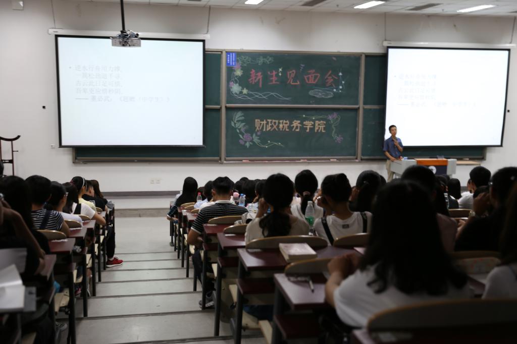 首先,由白彦锋院长发表了讲话,他向2017级的同学表达了热切的欢迎,为新生上了第一课。他以北邮同学大二辍学的例子告诫同学们大学生活中老师们不会时刻跟随在同学们身边,要处理好游戏、看片和大学生活之间的关系,正确看待交友和恋爱,要有健康的精神生活。紧接着,白院长介绍了学校、学院的历史发展,并详细介绍了学院的几大专业和学科和各种发展方向。在对同学们的优异成绩给予肯定和鼓励后,白院长提到中国目前已经是全球第二大经济体,位于世界前列,经济发展要有学术,有理论,目前同学们接受的鲜花和掌声已经足够多,要谨记“生于忧患,死于安乐”的道理,鼓励同学们珍惜大学的学习时光,不要做一个消费者消费荣光,要成为一个生产者为学校增光添彩,为祖国做贡献。随后,他提到在大学生活中同学们要学会理财,俭以养德,并且要培养批判性思维方式,“贵有恒何必三更眠五更起,最无益只怕一日曝十日寒”,推荐大家可以通过听广播来积累对财税问题的敏感度,并以王亚男治学的例子提醒同学们注重锻炼身体。最后他提到,财政学是用大智慧推进国家治理,经世济民,期待大家努力学习,成为财税改革的“弄潮儿”。