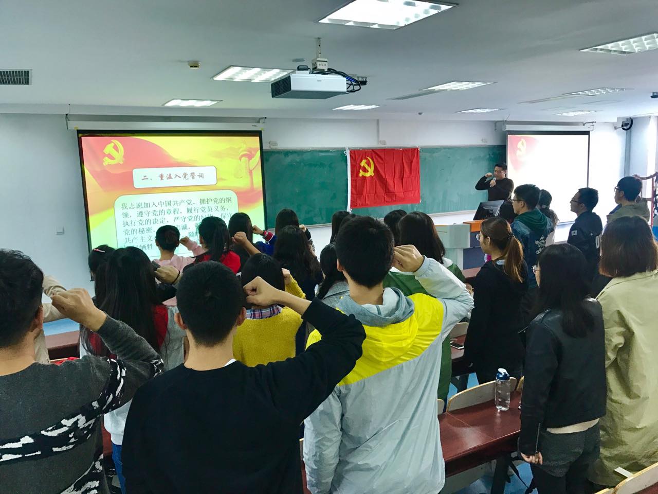此次活动分为奏唱国歌,重温入党誓词和书记第一课三个环节。在奏唱国歌和重温入党誓词之后,樊勇书记为2017级全体研究生党员上了生动的一课。