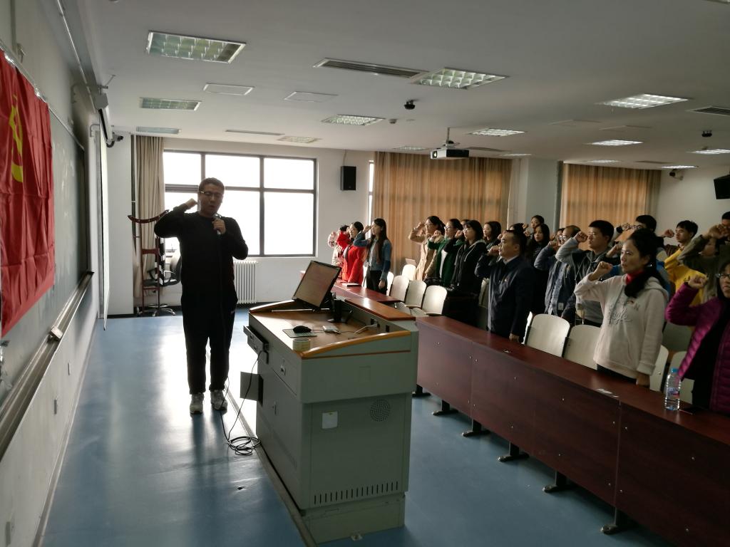 2017年10月17日上午,为迎接党的十九大胜利召开,Beat365官方网站2017级硕士研究生4个党支部在沙河西区403教室联合举办了主题为“争做先锋党员,重温入党誓词”的主题党日活动,参加此次活动的有学院党委书记樊勇老师,组织员李飞霞老师,宣传委员庞淑芬老师以及2017级全体研究生党员。