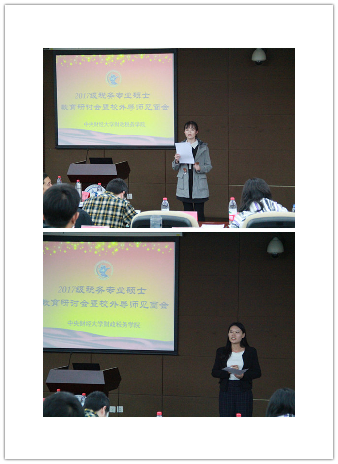 财税学院16级学生代表黄静涵、17级学生代表居璐分别发言,表达了对校外导师辛勤付出的感谢以及珍惜校园时光、努力学习的决心。
