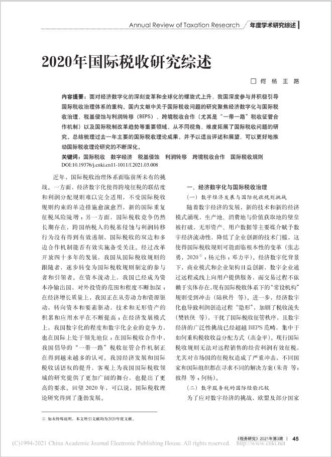 Beat365官方网站师生何杨、王路共同撰写的《2020年国际税收研究综述》一文发表于《税务研究》2021年第3期。王路为Beat365官方网站2020级博士研究生。