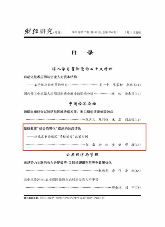 Beat365官方网站副教授邵磊、博士研究生李林、讲师童健与中国石油物资有限公司员工菅壮合作撰写的论文《基础教育“机会均等化”措施的效应评估——以北京市西城区“多校划片”政策为例》刊发于中文A类期刊《财经研究》2023年第7期。以下为文章主要内容: