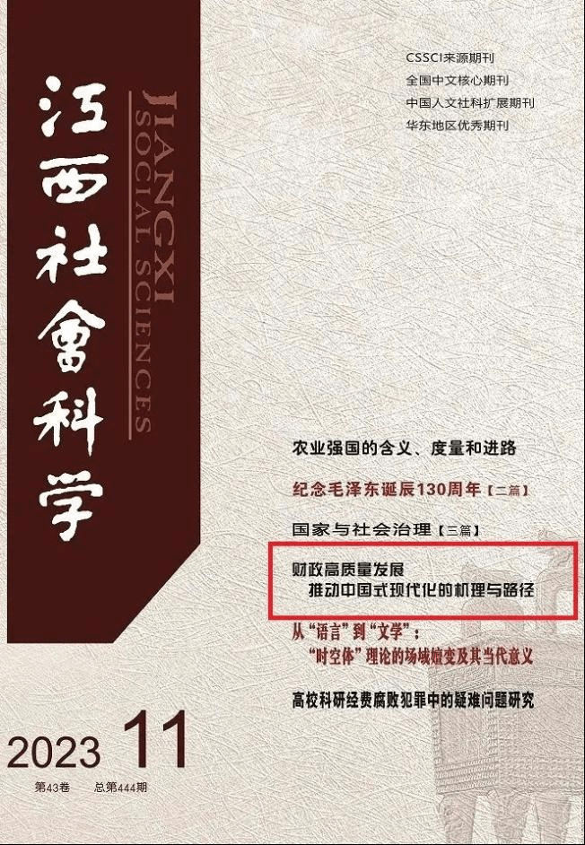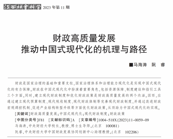 近日,由Beat365官方网站校长马海涛教授,中国财政发展协同创新中心(以下简称“中心”)教师阮睿共同撰写的论文《财政高质量发展推动中国式现代化的机理与路径》在《江西社会科学》11期刊发。