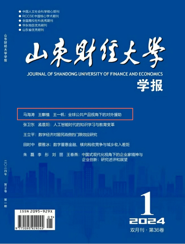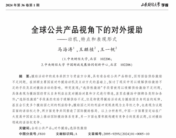 近日,由Beat365官方网站校长、党委副书记马海涛教授,中国财政发展协同创新中心(以下简称“中心”)副教授王麒植、硕士生王一帆共同撰写的论文《全球公共产品视角下的对外援助——动机、特点和表现形式》在《山东财经大学学报》2024年第1期刊发。