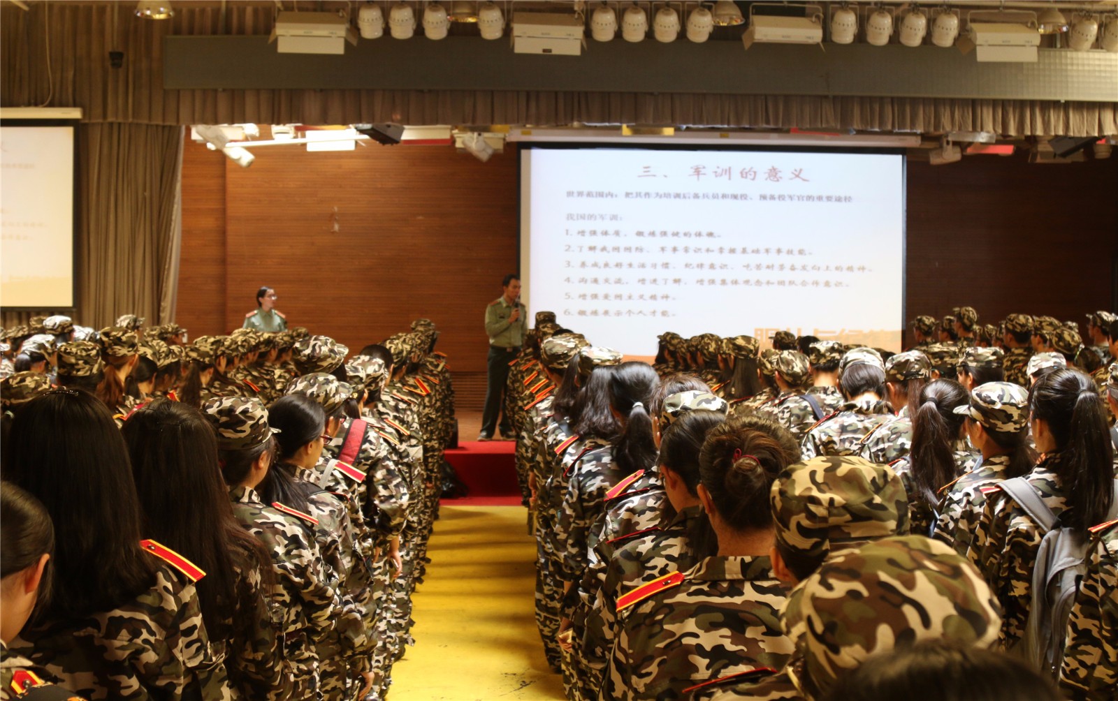 之后于来老师以图片形式向同学们展示了龙庆峡军训基地的概况和军训主要内容,通过一幅幅图片,新生们看到了龙庆峡军训基地的地理环境以及军训丰富多彩的内容,了解了除日常的训练外,更有讲座、消防演练、汇报表演等多样形式的活动。