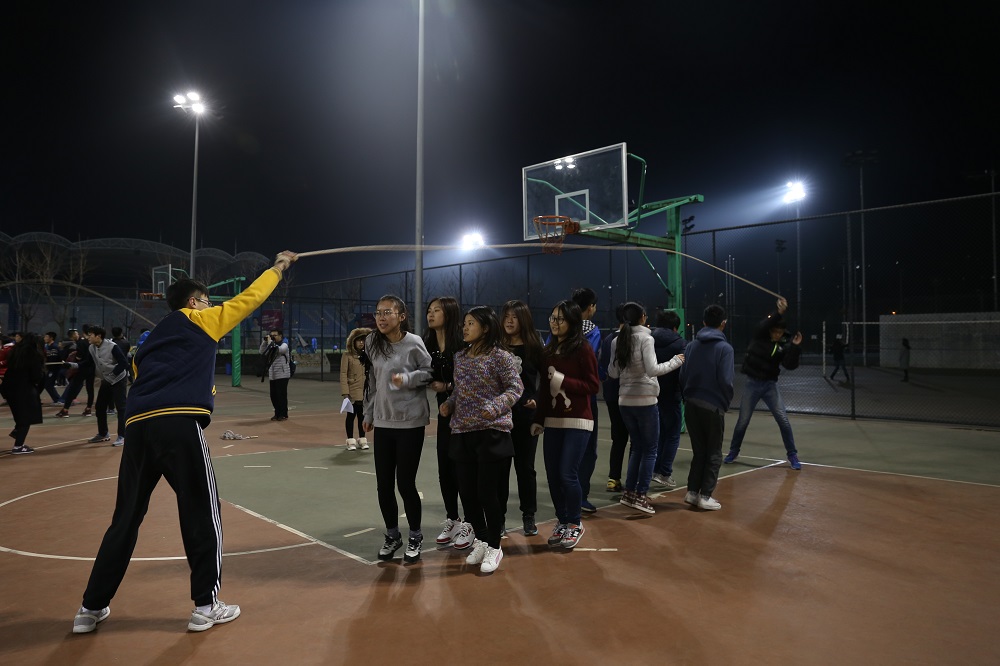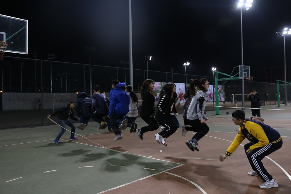 尽管夜晚天气寒冷,参赛的同学们仍然提前来到了比赛场地组织练习,希望在练习中得以相互磨合,在比赛中能够有更加默契的配合。与淘汰赛的规则不同,决赛中每支队伍全体参赛队员一起跳绳,计时4分钟,总数多的队伍获胜。