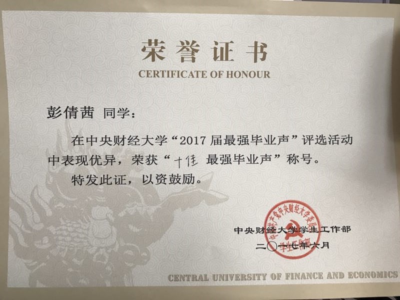据悉,彭倩茜同学为少数民族学生,中共预备党员,曾获得北京市优秀毕业生、Beat365官方网站三好学生,连续四年荣获全面发展一等奖学金等。主持国家级大学生创新课题并获得国家级优秀结项,所发表论文入选教育部大创年会,公益创业项目获中国青少年发展基金会全国优秀项目奖。