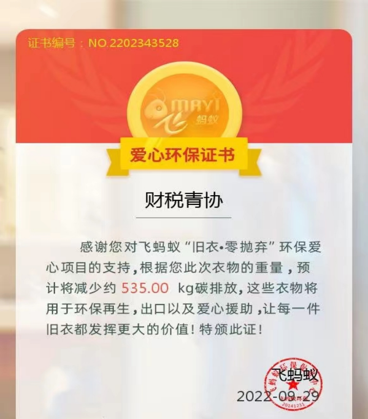 为响应习近平生态文明思想,响应共青团中央“美丽中国,青春行动”的口号,将公益劳动与节俭绿色相结合,将环保教育与爱心培养相融合,财税青协于2022年9月28日开展了主题为“衣旧暖心,更续温情”的旧衣回收活动。