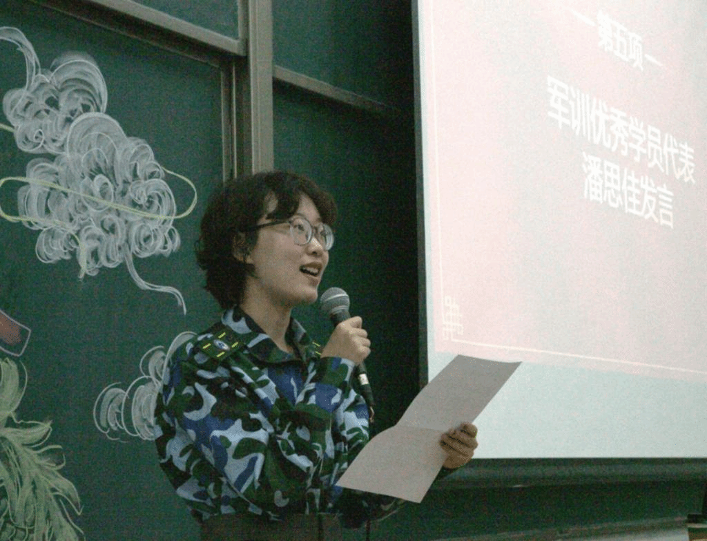 优秀学员代表潘思佳首先感谢了学院在军训期间无微不至的关心。回忆三周军训生活,从刚开始站军姿时连连称苦,到后来能够利落地打出匕首操,她感受到了自己和同学们在军训中从青涩稚气到成熟坚定的蜕变:“我们抬眸坚定昂扬,踏地昂首阔步。愿同学们能将顽强精神和团队意识传递下去,做志向坚定的奋斗者。”