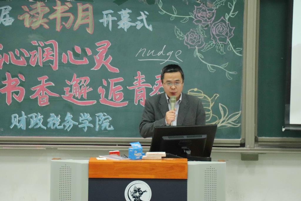 活动首先由财税学院院长白彦锋老师致辞,白院长向同学们介绍了等优秀的学院老师,并感谢他们的到来。紧接着,白院长又表达了对同学们积极参与读书月的活动的殷切希望。而后,白院长又向同学们提出了读书的三点建议,一是读书要贴近时代的步伐,现阶段,同学们可以阅读一些党的十九大报告,紧跟党的脚步;二是要多读一些与我们专业相关的书籍,并举了单词“nudge”的例子,鼓励我们读一些英文版的专业书籍;三是要多读一些中国传统文化的书籍,弘扬传统文化。最后,白院长背诵岳飞的《满江红》,宣布读书月开幕式正式开始。