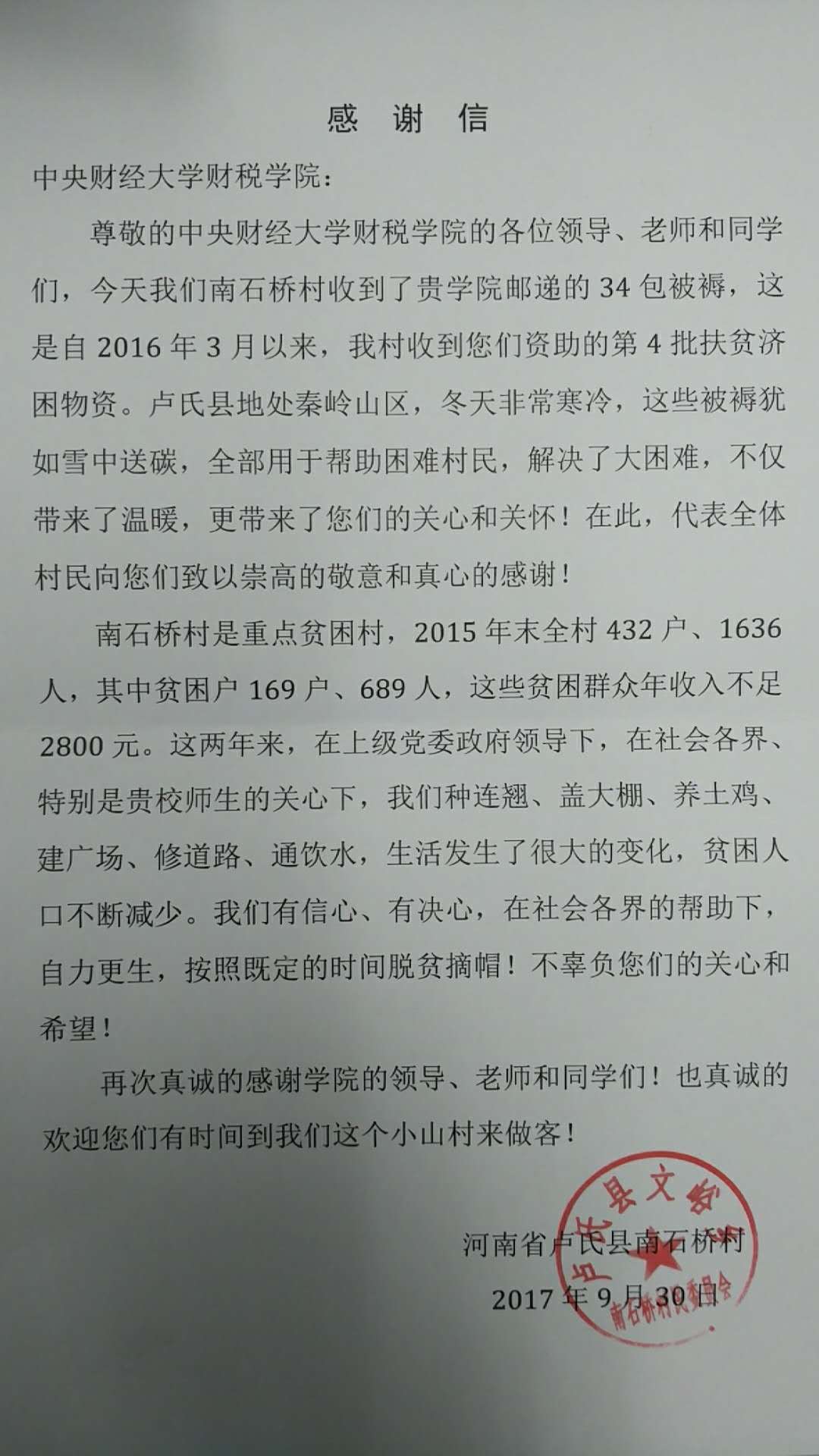 在院学生工作办公室和团总支负责老师精心协调下,共整理了学院在以往开展活动中积存的34包被褥,并统一打包邮递到南石桥村。南石桥村委会在接收到捐献物资后,特发来感谢信,表示扶贫物资为山区人民解决了过冬的大困难,犹如雪中送炭,带来了温暖和关怀。
