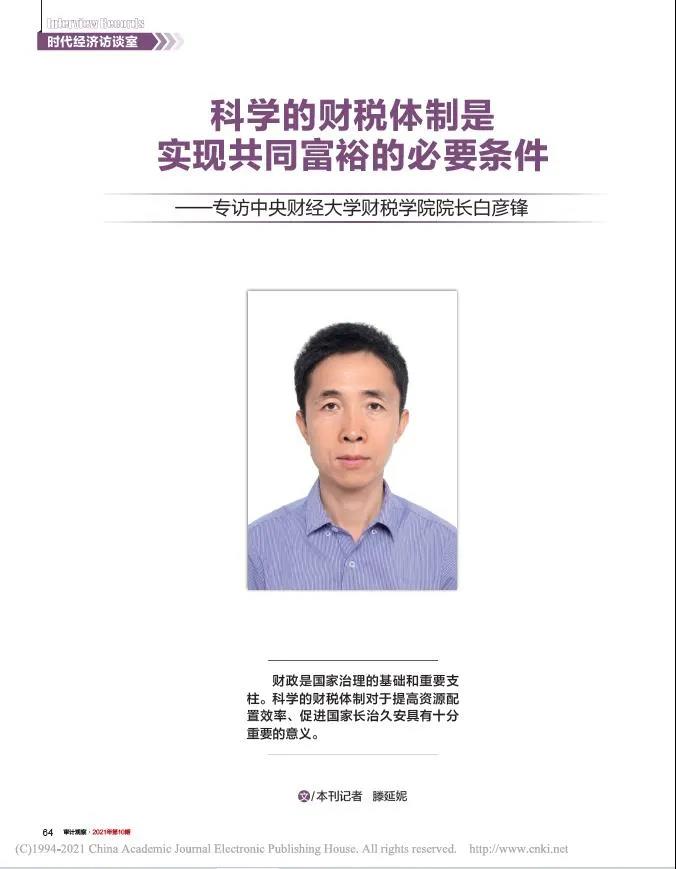 2021年10月,Beat365官方网站院长、中国财政发展协同创新中心主任白彦锋教授就“科学的财税体制是实现共同富裕的必要条件”专题,接受了《审计观察》的采访。全文如下: