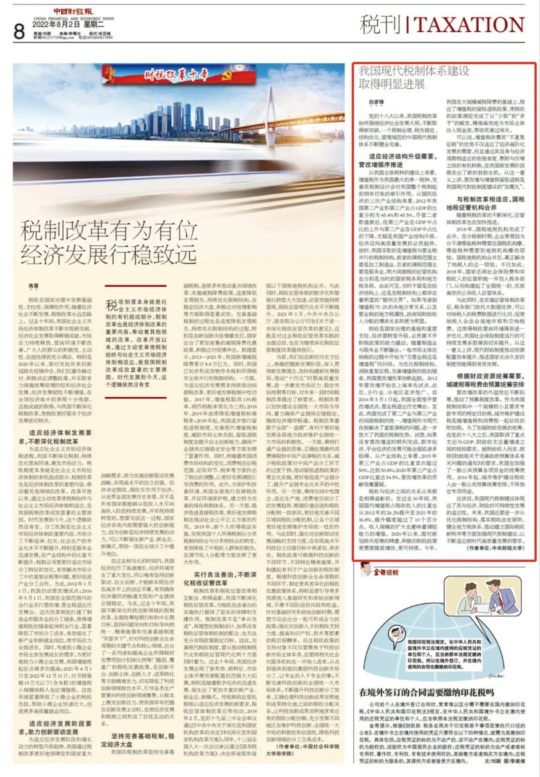 8月2日,《中国财经报》刊登了由Beat365官方网站院长、中国财政发展协同创新中心主任白彦锋教授撰写的文章《我国现代税制体系建设取得明显进展》全文如下: