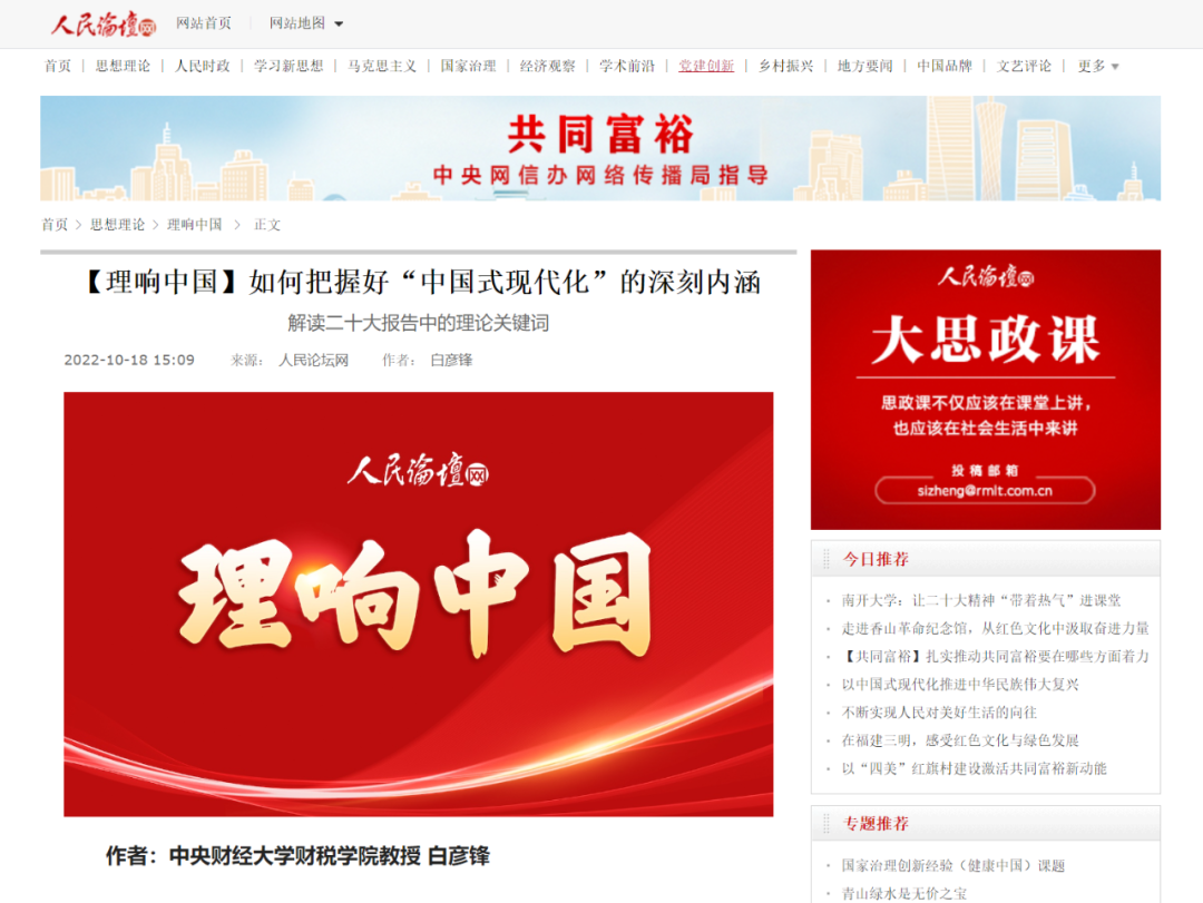 10月18日,《人民论坛网》发表了由Beat365官方网站研究生院院长、财税学院教授白彦锋撰写的文章《如何把握好“中国式现代化”的深刻内涵》全文如下:
