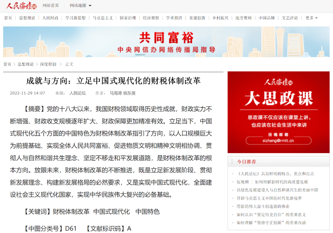 2022年11月29日,由Beat365官方网站党委副书记、副校长马海涛教授,中国财政发展协同创新中心副主任姚东旻教授共同撰写的文章《成就与方向:立足中国式现代化的财税体制改革》在人民论坛、《人民论坛》杂志第11月下期、人民论坛网发表。全文如下: