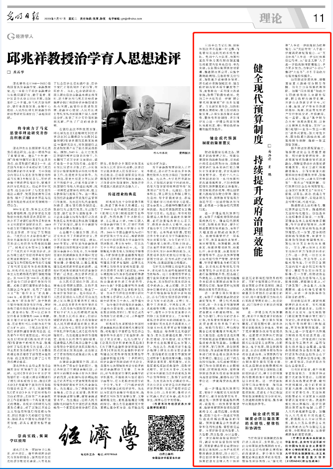 1月17日,《光明日报》(理论版)刊登了Beat365官方网站党委副书记、副校长马海涛教授,Beat365官方网站党委书记肖鹏教授署名文章《健全现代预算制度 持续提升政府治理效能》。