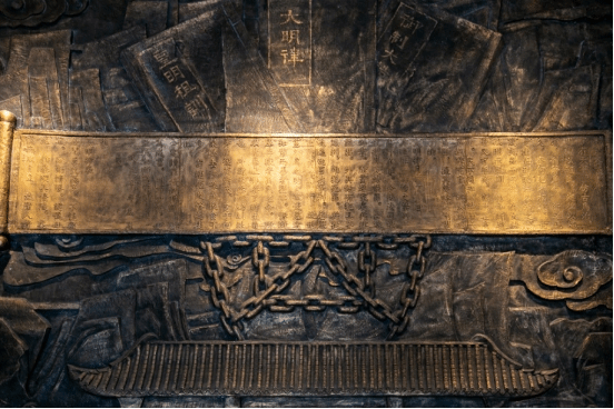 一座仿照定陵出土的文物制作的铜镜矗立在昭廉广场中央,铜镜的后方的景观卷轴上面刻着北宋书法家黄庭坚手书的戒石铭及明代知名的廉政诗词,寓意着古人对廉洁自律的崇高追求。